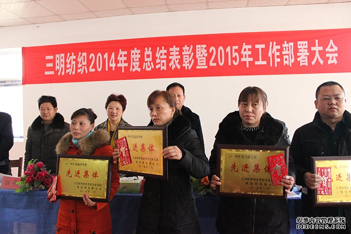 总结表彰过去,部署规划未来。李亚平总经理对广大员工的辛勤工作表示肯定的同时亦提出四点工作要求:一是强化队伍建设,打造一支高效团队。三明纺织的发展,离不开一支强有力的管理队伍,更离不开一支特别能吃苦、特别能战斗的高效团队。二是抓好质量管理,提升产品档次。树立全员质量危机意识,建立全员参与质量管理的模式,重视客户反馈的各种质量问题,完善质量管理体系,全面提高棉纱质量水平。三是压降生产成本,强抓扭亏增盈。扭亏增盈是2015年三明纺织的工作重心之一,公司将紧紧围绕这一重点压降生产成本,降低行政费用支出,降低机物料消耗,降低吨纱、水、电消耗,力争以最有效的投入,得到最大限度的回报。四是抓安全生产,确保全年实现“三无”目标,把班组、车间作为安全防范的前沿阵地,加大违章操作的处罚力度,时刻绷紧安全生产这根弦,确保全年生产无重伤、无重大火情、无重大设备事故。