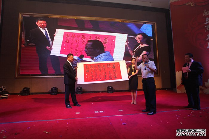 ▲常务副会长刘加亮代表商会上台接受书法名家沈沪林老师的馈赠作品。