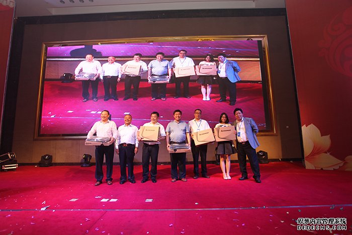 ▲特等奖iPhone6 plus尘埃落定,盐城市政协副主席、工商联主席吕拔生(左)和会长戴春明为幸运儿颁奖。
