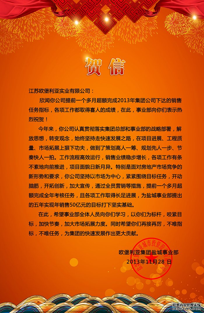 11月28日,欧堡利亚集团盐城事业部特别为旗下江苏堡利亚实业有限公司提前一个多月完成全年销售目标发来贺信,以充分肯定该公司取得的成绩,也对全体干部员工表示鼓励。
