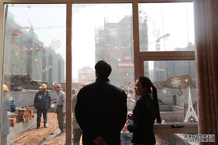 ▲置业顾问陪同客户看正在建设中的悦府