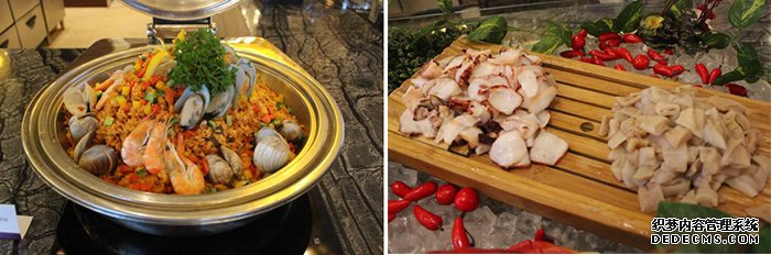 由特制的鲜奶油蛋糕、自助海鲜、各色各样的饮料等组成的主菜、甜点和酒水让情侣们二人世界迅速升温,空气里泛着甜甜的浪漫。