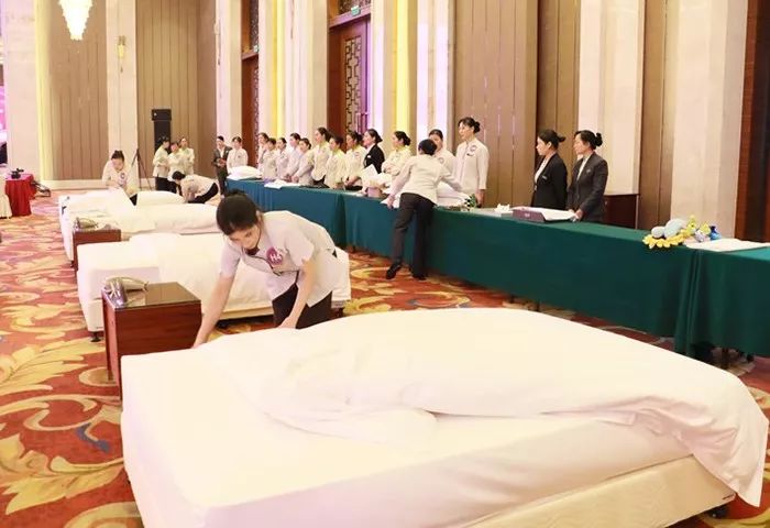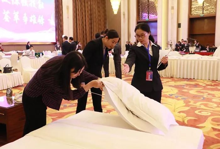 客房服务参赛选手们镇定自若,争分夺秒,抛单定位,不偏离中线,包角准确而平整,动作娴熟敏捷、干净利落、一次到位,有力展现了日常扎实的基本功,也诠释了“台上一分钟,台下十年功”的真谛。