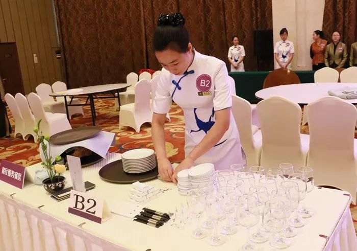 餐厅服务参赛选手面带微笑,动作流畅自然,左手举着托盘,右手拿着餐具,侧着身子将餐具整齐地摆放在桌上,桌上的杯子、盘子、刀叉、椅子的摆放位置、角度、距离都是经过长时间反复练习而用“心尺”精确测量的作品,现场的评委和观众不时报以热烈的掌声。