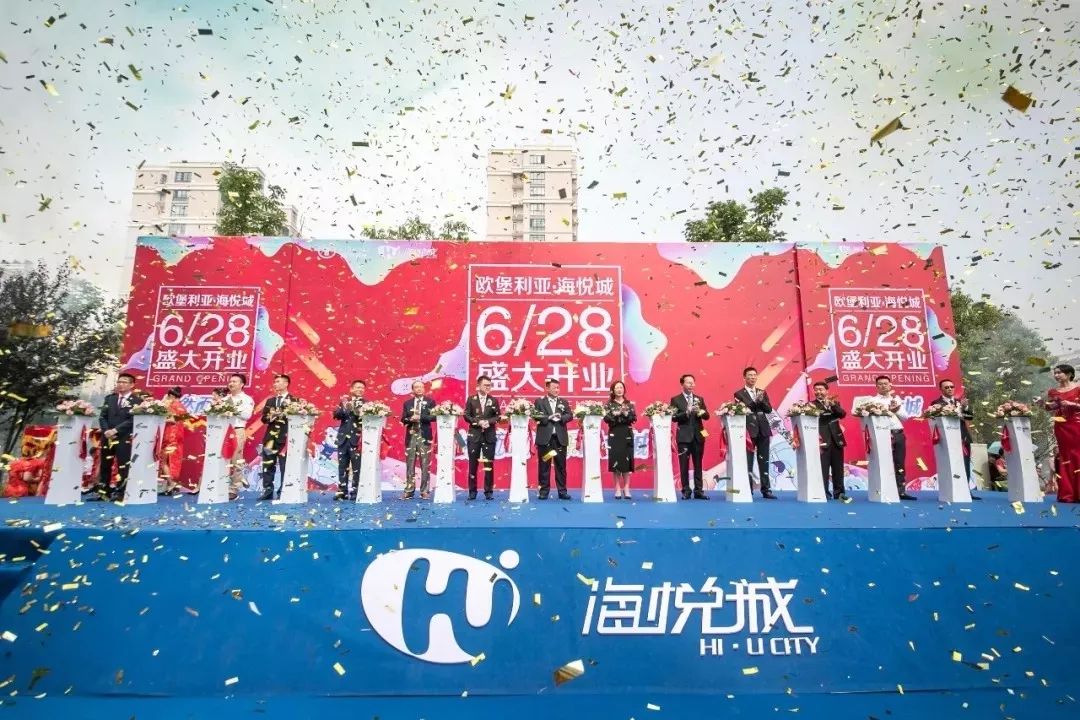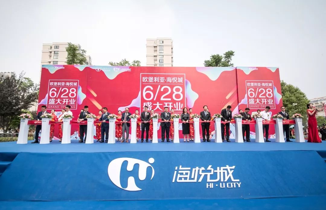锣鼓鸣,音乐起。在礼仪小姐的引领下,欧堡利亚领导上台进行剪彩仪式。随着主持人和现场观众一起倒数,嘉宾们一同剪彩,鼓乐齐鸣,礼花、彩烟同放,现场热闹非凡,主持人宣布海悦城正式开业!