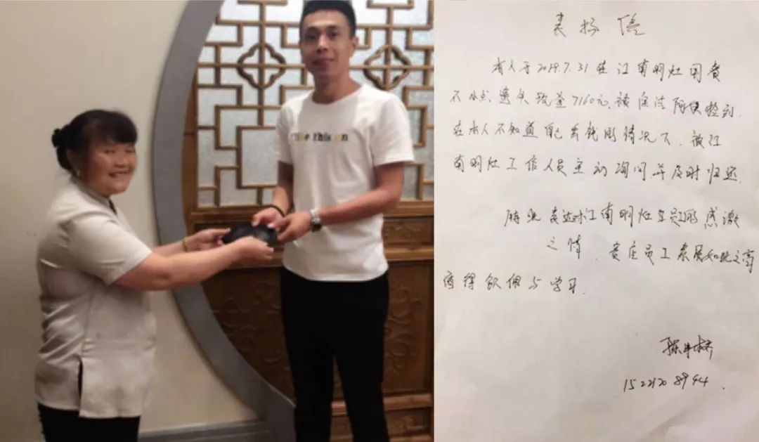 7月31日中午,欧堡利亚江南明灶保洁员杨海云在打扫2楼公共区域卫生时,蓦然发现宾客等位区的长椅上有一只透明、鼓鼓的黑色钱包, 看上去现金就有好几千元。尽管她的家庭并不富裕,上有老下有小,保洁岗工资也较微薄,但面对金钱的巨大诱惑,她表现得十分坦然,第一时间内将钱包交到了收银台,并在2名收银员的共同见证下,得知钱包中有7160元的现金。等候10分钟还不见失主前来认领,收银员便立即向酒店领导汇报,并在服务部管理人员逐一询问现场就餐的宾客后,最终在包厢A11找到了钱包的失主。