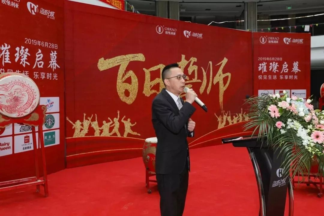 欧悦商业总经理刘炳跃先生在大会上发表精彩致辞,刘总总结回顾了海悦城项目启动至今的数次历史性的跨越,万达影城、万达宝贝王、必胜客等80%的商户首次入驻滨海,为我们进一步推进工作打下了坚实的基础;他对未来100天的战斗历程表达了自己的期盼和决心,号召大家振奋精神,鼓足干劲,把开业前100天的时间安排好、利用好,争分夺秒,竭尽所能,力争将欧堡利亚·海悦城打造成滨海最繁华的城市新中心!