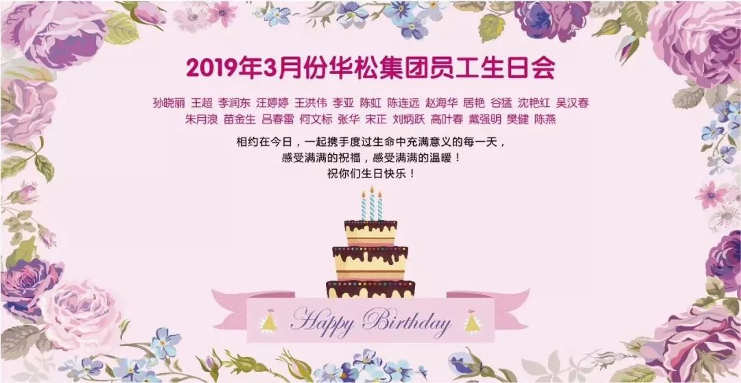 插花环节完毕后,欧堡利亚华松集团还为三月份过生日的员工举办了一场集体生日会,为当月的寿星送上了生日祝福,准备了生日蛋糕和精美礼品。“小小生日会,浓浓华松情”,整个会场到处弥漫着鲜花的芬芳和感动,“生日快乐”四个字更是为现场增添了不少的春日浪漫和温馨,同时也表达公司对员工的点滴关怀,塑造优良的人性化管理,促进员工对企业的信任,推动欧堡利亚华松集团良性健康发展。