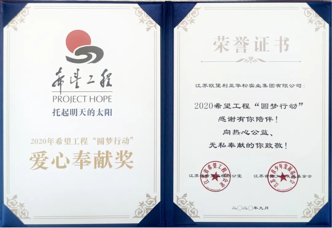 欧堡利亚地产集团荣获2020年希望工程“圆梦行动”爱心奉献奖