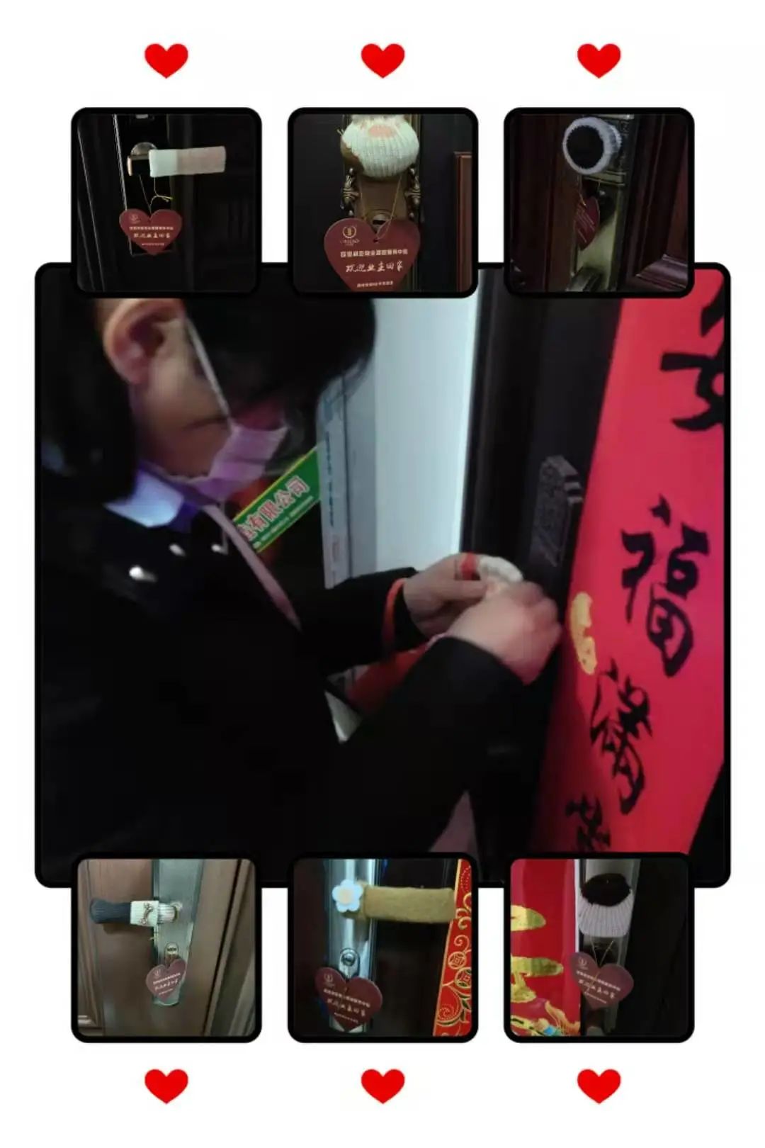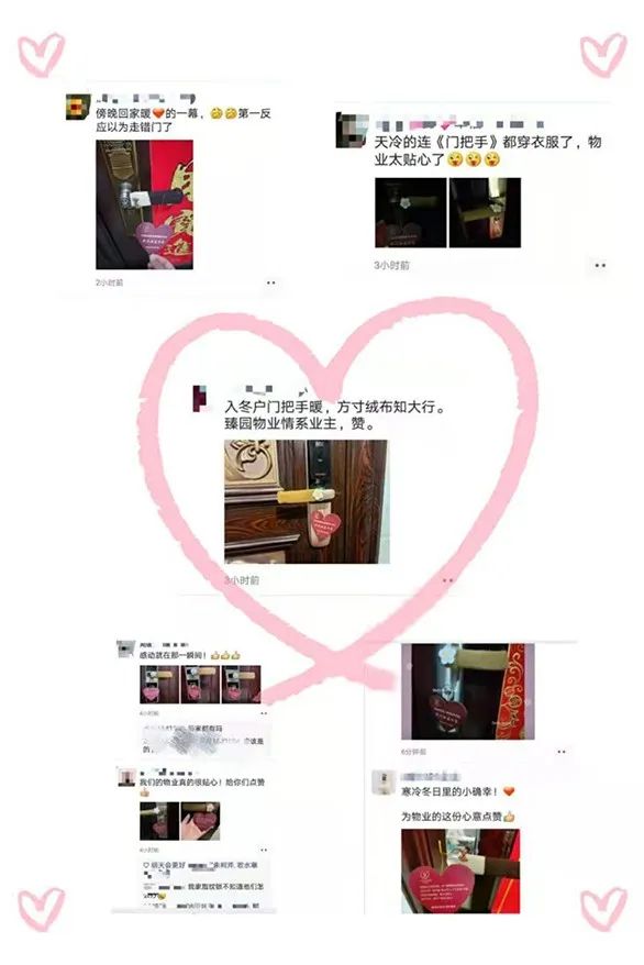 小小的门把手套,温暖了业主的手,也温暖了业主的心,朋友圈也被充满爱意的温暖刷屏啦~欧堡利亚物业将爱与陪伴凝聚成这个冬日温暖的回忆!! 寒冷冬日,让我们一起暖心同行!欧堡利亚物业愿你三冬暖,愿你春不寒。时光在流转,岁月在轮回,不变的是我们对您持久而温暖的服务,您的满意,永远是我们前进不止的动力!