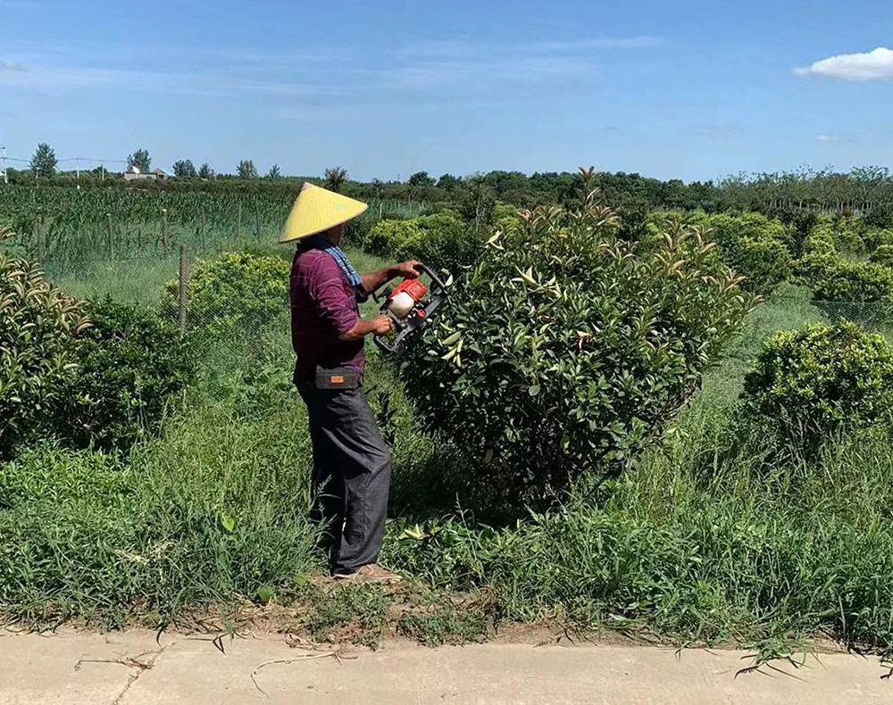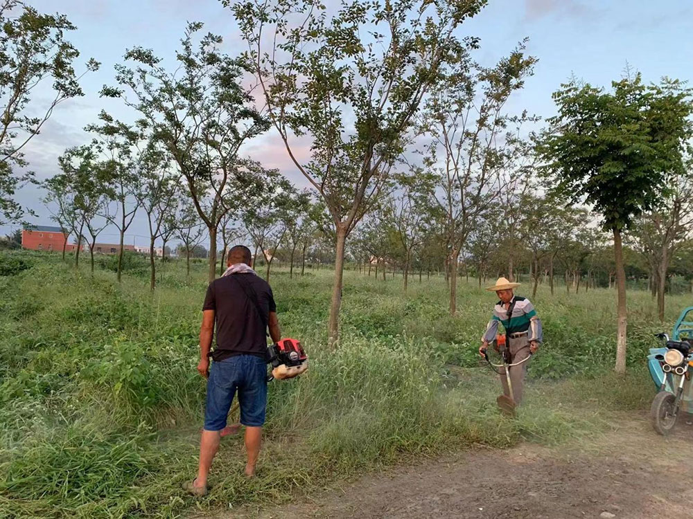 老王一边指挥修剪工作,一边安排园林工人薛为岗、顾宝明两位师傅进行除草。随着机器的摆动,除草机头左右来回在林下的杂草上扫动着,在高速旋转的打草刀片下,很快的一片片平整的草坪呈现出来。